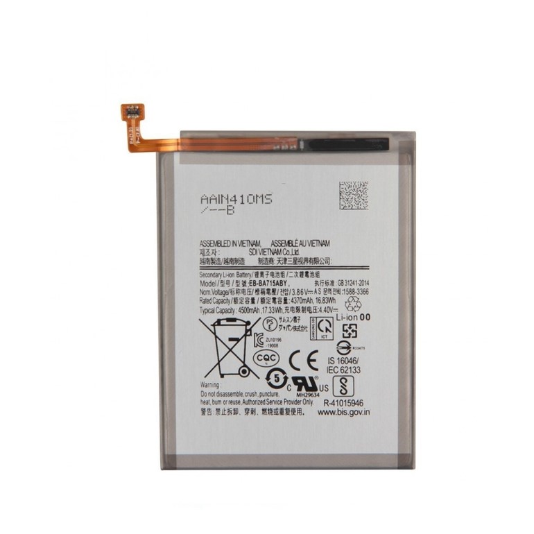 باتری اصلی A71 دارای ظرفیت ۴۵۰۰ میلی‌آمپر و از نوع لیتیوم پلیمری (Li-Po) است. سامسونگ این ظرفیت را برای ایجاد تعادل بین وزن، ضخامت و شارژدهی بالا طراحی کرده است. باتری A71 با کد فنی EB-BA515ABY شناخته می‌شود و اگر نمونه اصلی را تهیه کنید، سرعت شارژ، بازده انرژی و کنترل دما کاملاً استاندارد خواهد بود.
